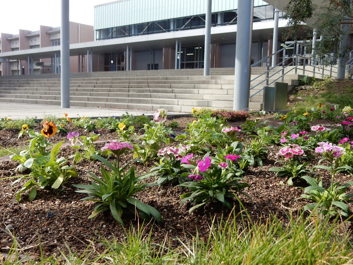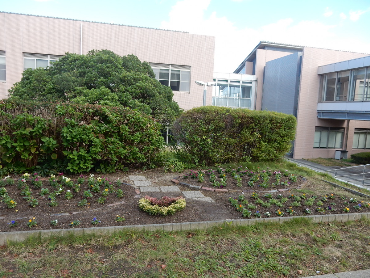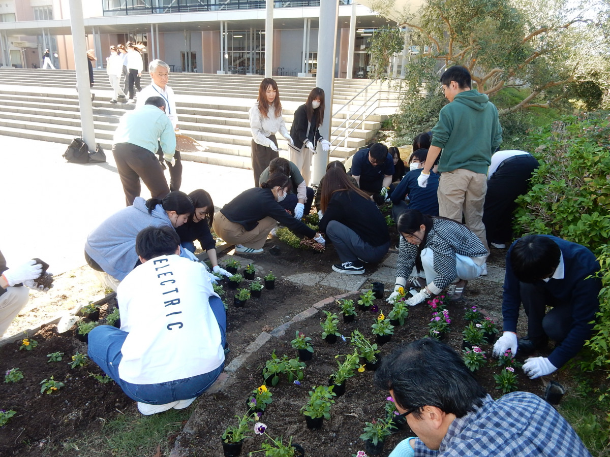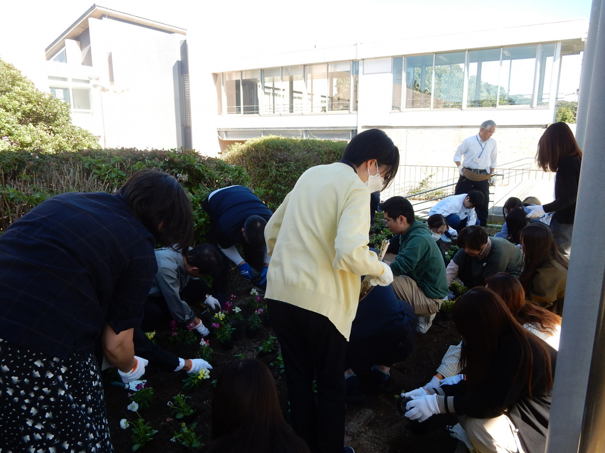 令和7年10月24日(金)の昼、浜田キャンパスの平岡都さん記念花壇「Garden of Hope」に、学生や教職員が集まり、秋の花苗の植替え作業を行いました。