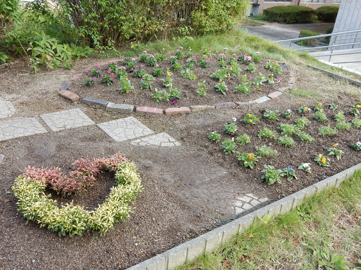 花壇にはパンジー、ビオラ、アリッサム、キンギョソウ、ナデシコ、アキランサスなど、色とりどりの花苗を並べ、参加者全員で心を込め丁寧に植えました。