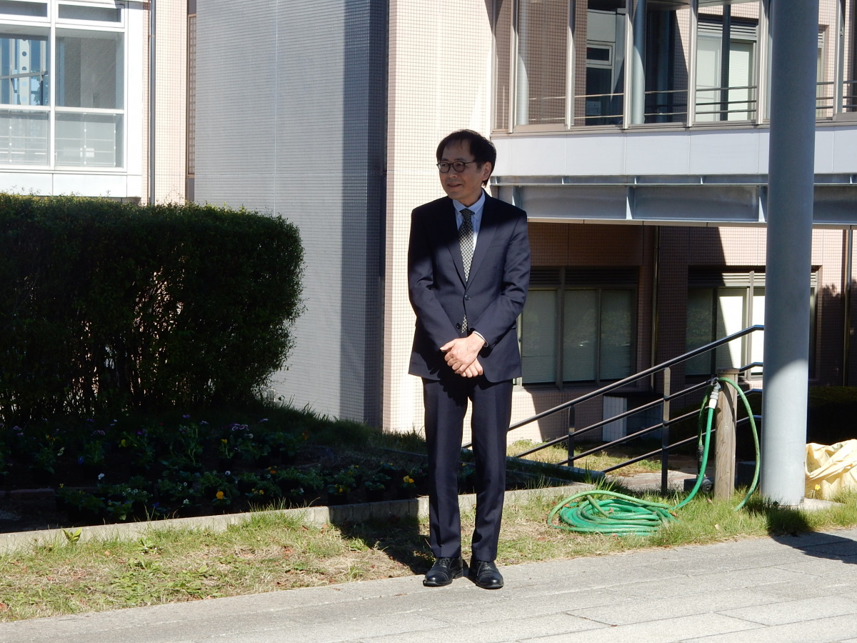お手入れに先立ち、林副学長よりご挨拶があり、参加者全員で平岡さんへの追悼の意を込めて、静かに黙祷を捧げました。