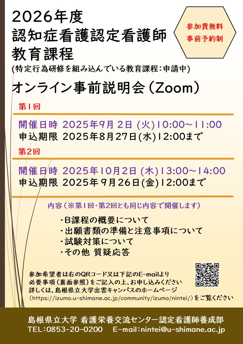 2026年度認知症看護認定看護師教育課程のオンライン事前説明会(Zoom)を開催します。詳しくはチラシをご覧ください。