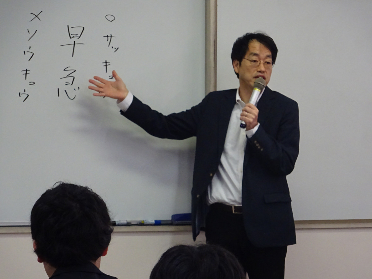 文化情報学科の山村 仁朗先生は『「さっきゅう」か「そうきゅう」か ー「早急」の読み方についてー 』という演題でお話しました。
