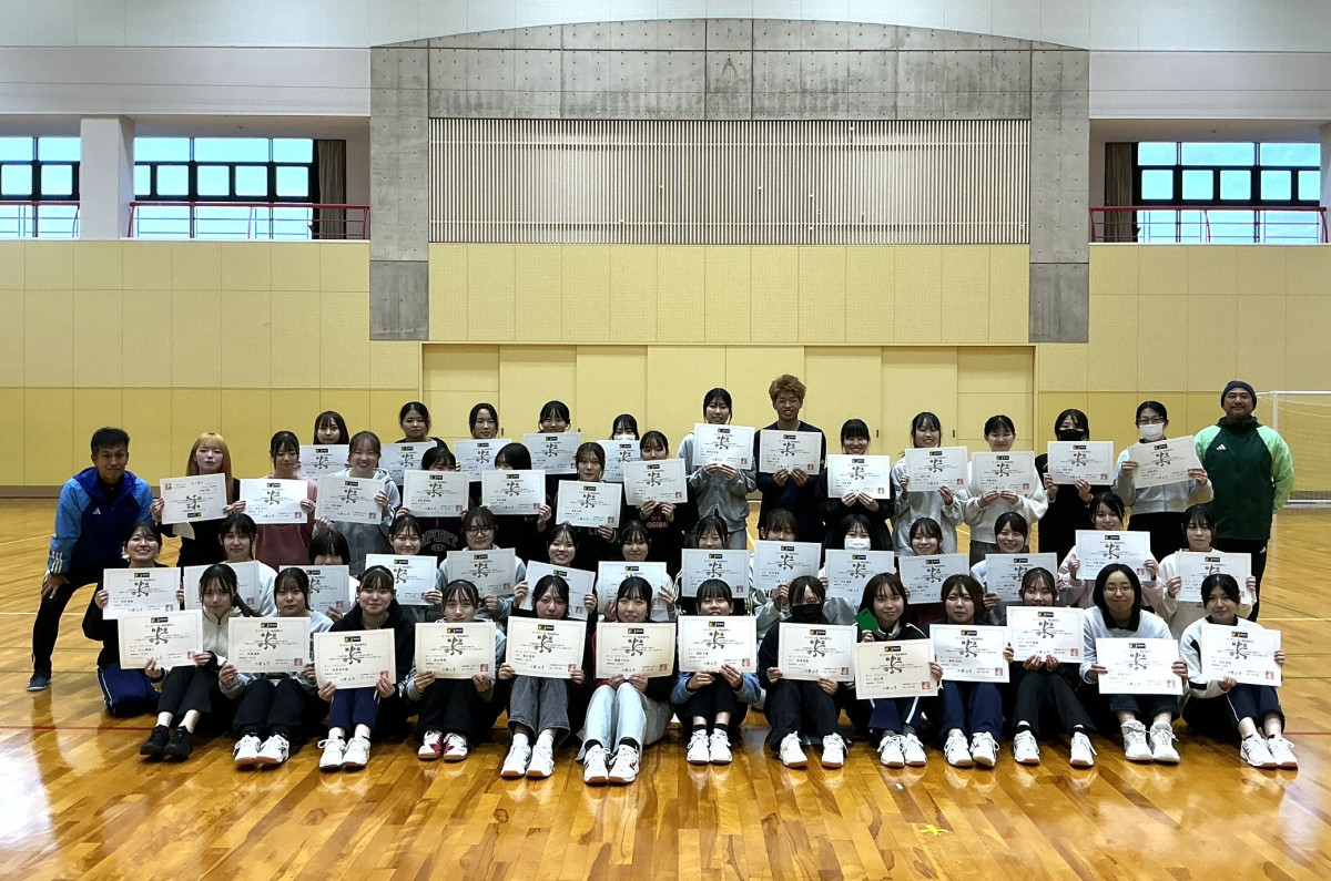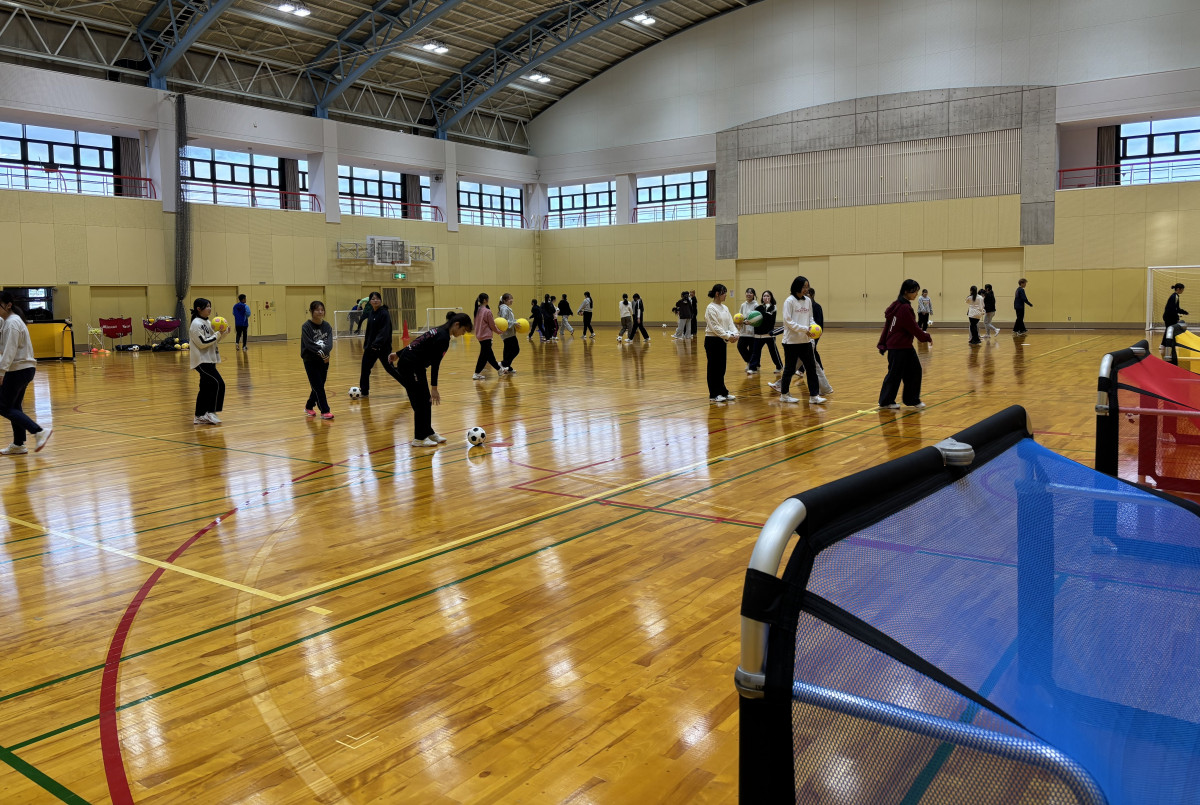今回で4回目となるJFA公認キッズリーダー養成講習会を松江キャンパスにて開催し、今年は松江キャンパスの全学科から1年生46名が受講しました。講義セッションでは、子どもの発育発達の特徴やその特徴を生かしたキッズ年代への関わり方を学び、実技では子ども役となり、運動遊びを実際に体験し、オーガナイズやアレンジの方法を学びました。講習会の合格者には、JFAキッズリーダーインストラクターからJFAキッズリーダーの資格証明書が手渡され46名のキッズリーダー資格取得者が誕生しました。