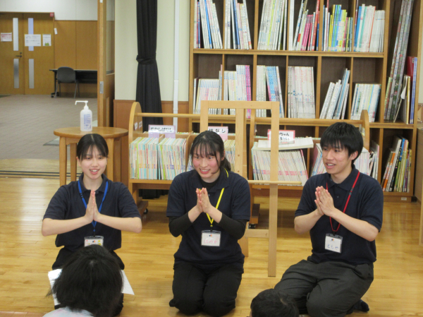 5月29日(木)、島根県立松江ろう学校小学部のみなさんがご来館されました。保育教育学科3年生3名と、絵本の読み聞かせやクイズ、手遊びを一緒に楽しみました。絵本をじーっと見つめる姿、...