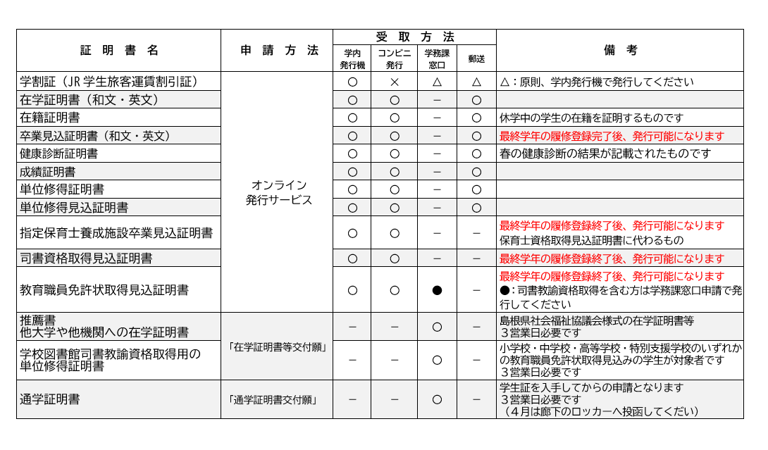 オンライン発行サービスで申請できない証明書は、「在学証明書等交付申請書」・「通学証明書交付申請書」または、管理棟事務室前の廊下の掲示棚にある各申請書に必要事項を記入して学務課へ学生証と一緒に提出して申請をしてください。