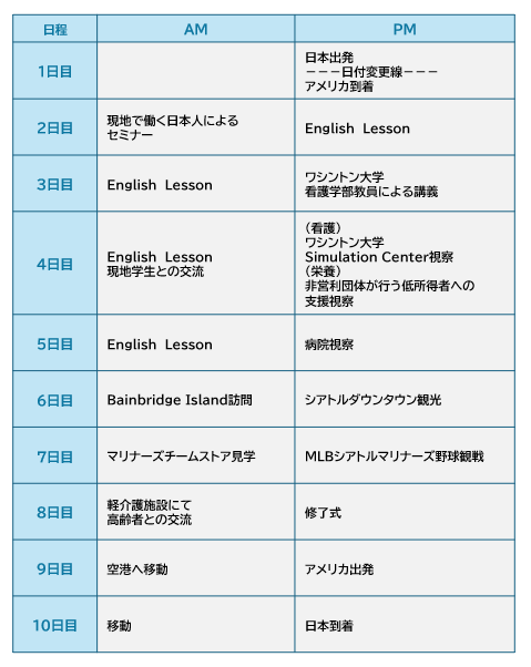 英語力の向上や、アメリカの医療機関、高齢者福祉施設、看護系・栄養系大学の見学をし、アメリカの医療事情等について学びます。