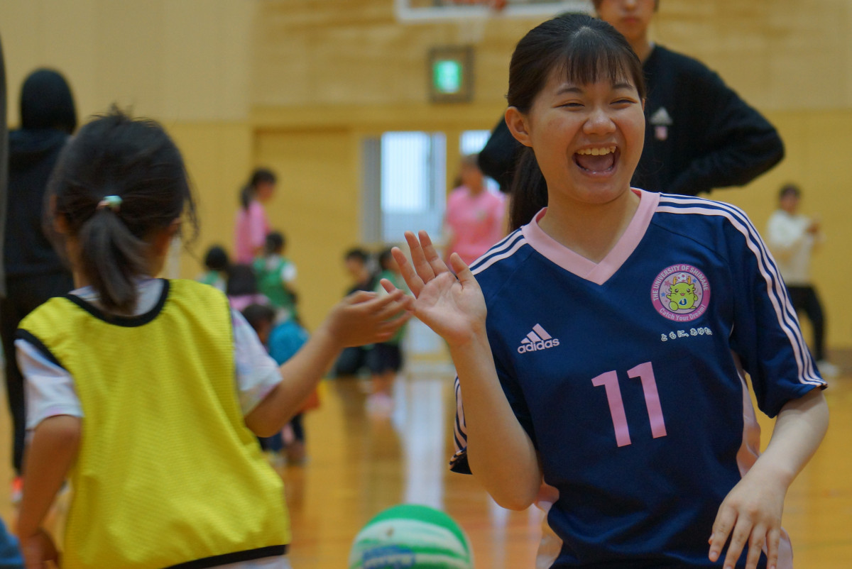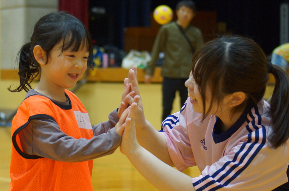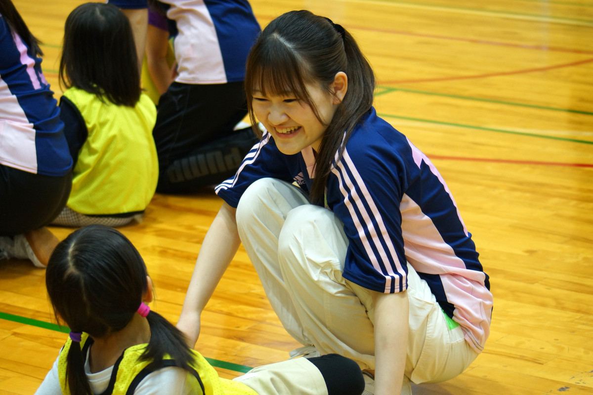 "笑顔とハイタッチ"をキャッチフレーズとして開催している”なでしこひろば”の活動を通して、運動好きな子どもと、運動指導の得意な学生を沢山増やし、地域に貢献したいと考えています。また、今年度の重点テーマとして”コミュニケーション:対話”をキーワードとして、ただ運動の指導をするだけでなく、”子どもの主体性を育む運動指導”をテーマに、子どもとの対話を大切にしながら実施しています。