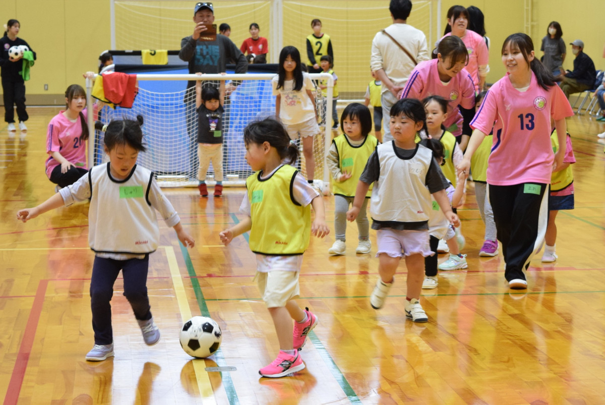 未就学児の幼児40名、小学校1年から3年までの女子児童34名と、(公財)日本サッカー協会公認キッズリーダー資格を取得した本学の保育学科・保育教育学科・地域文化学科で学ぶKENDAI NADESHIKO F.C.C(県大なでしこ地域貢献サークル)の学生56名と共に様々な運動あそびを楽しみました。