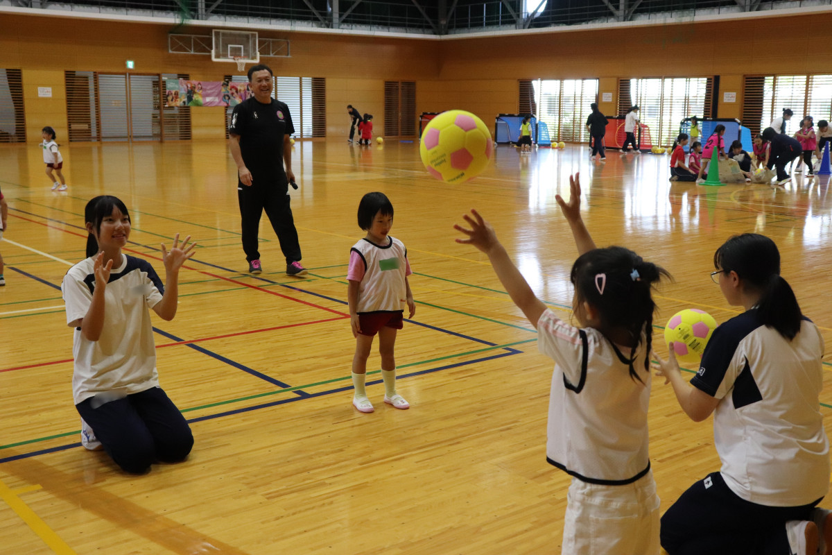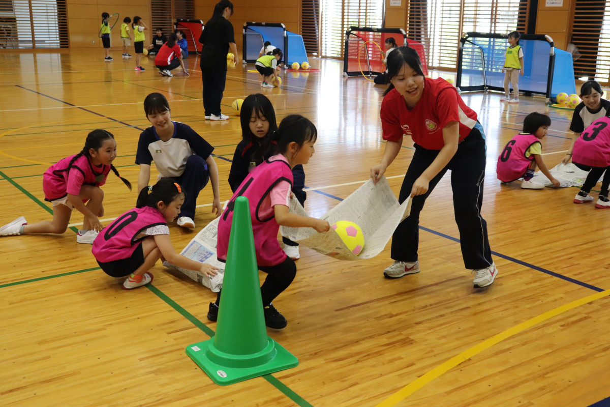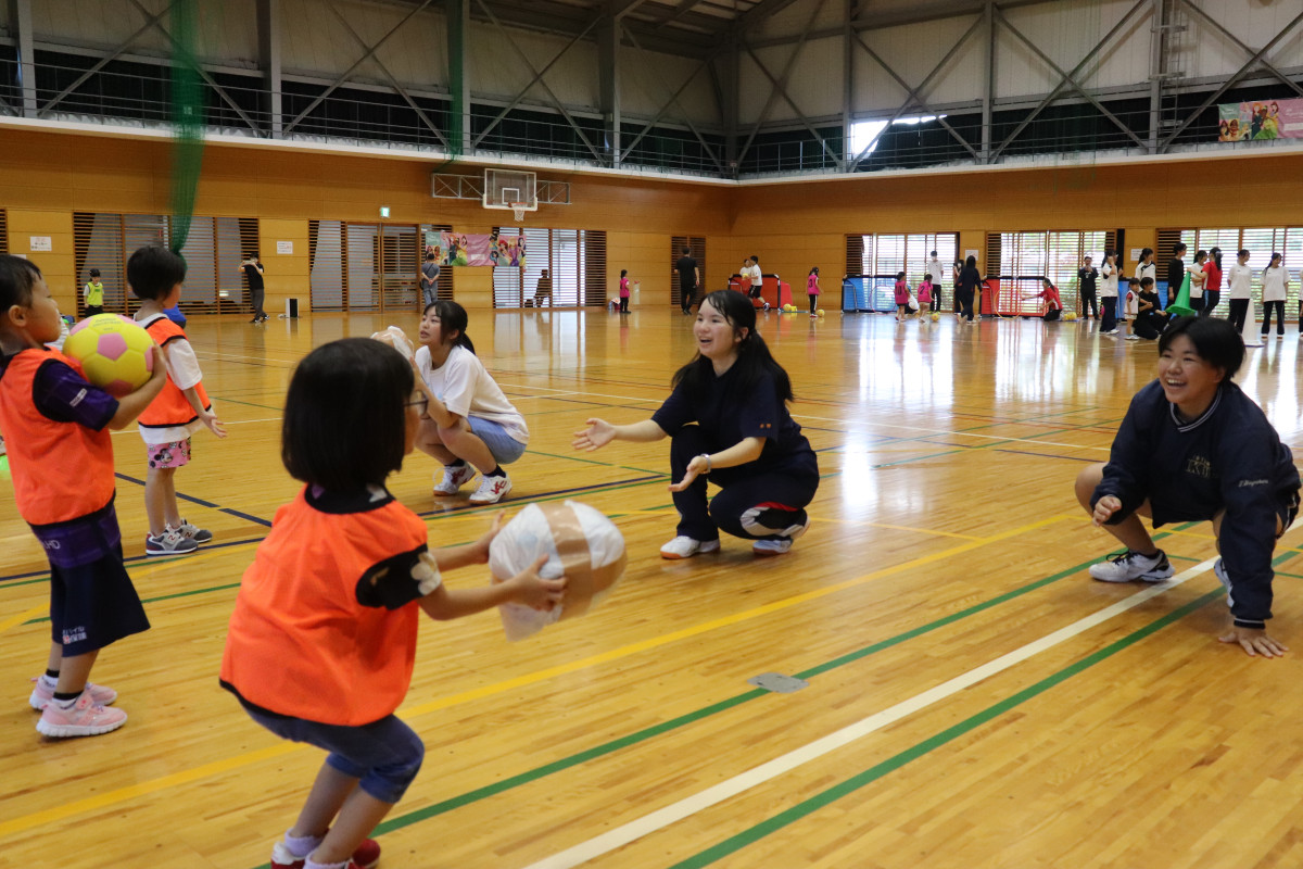 今回は、浜田キャンパスで1年ぶりの開催となり、未就学児~小学1年生までの児童29名、(公財)日本サッカー協会公認キッズリーダー資格を取得した本学の保育学科・保育教育学科で学ぶKENDAI NADESHIKO F.C.C(県大なでしこ地域貢献サークル)の学生5名、保育職・小学校教諭を目指す高校生23名が参加し、様々な運動あそびを楽しみました。