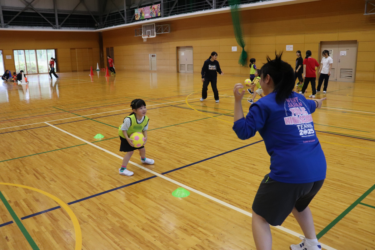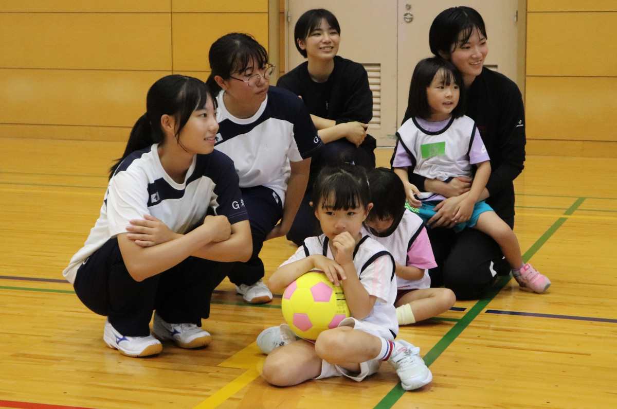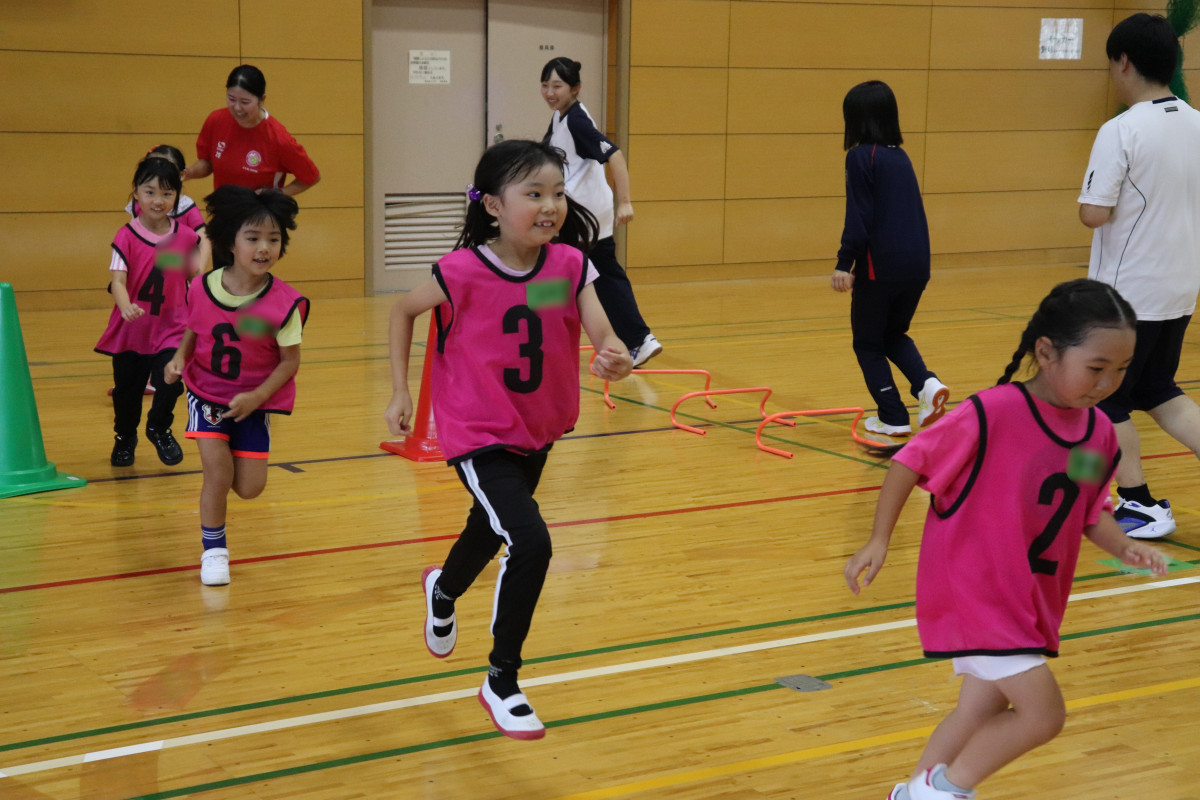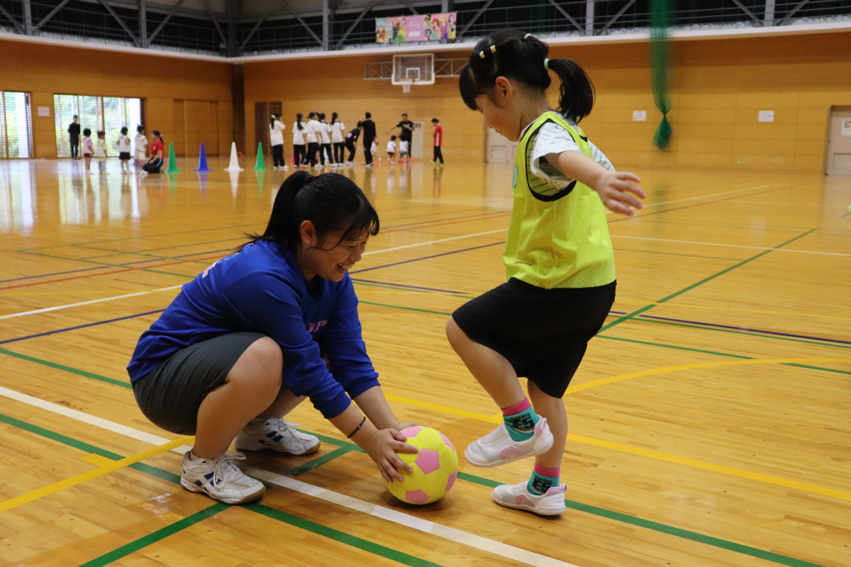 今回は、浜田キャンパスで1年ぶりの開催となり、未就学児~小学1年生までの児童29名、(公財)日本サッカー協会公認キッズリーダー資格を取得した本学の保育学科・保育教育学科で学ぶKENDAI NADESHIKO F.C.C(県大なでしこ地域貢献サークル)の学生5名、保育職・小学校教諭を目指す高校生23名が参加し、様々な運動あそびを楽しみました。