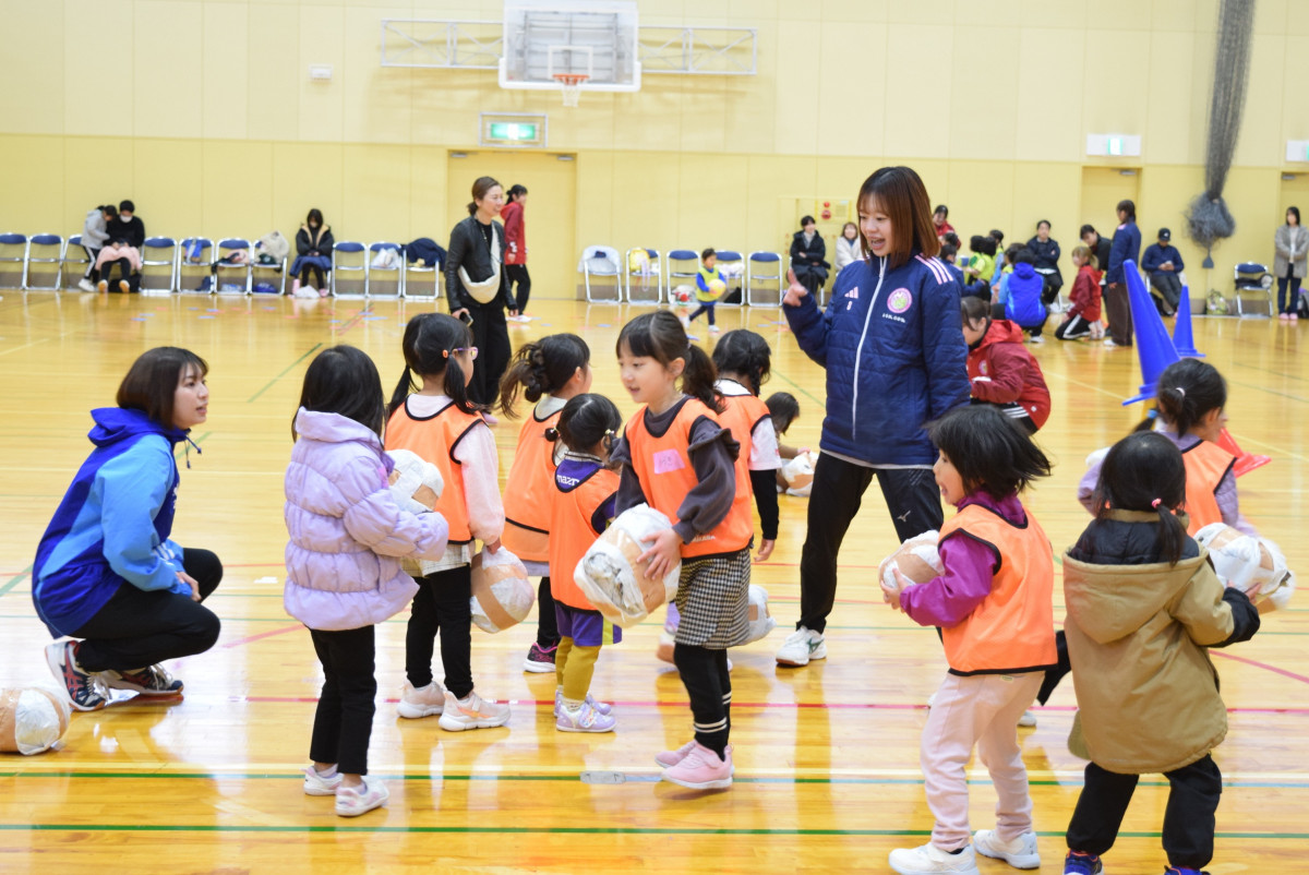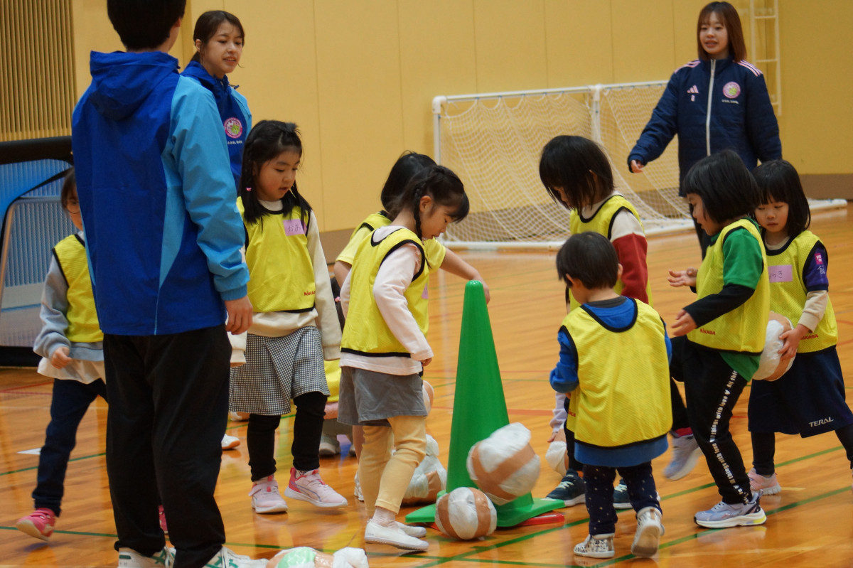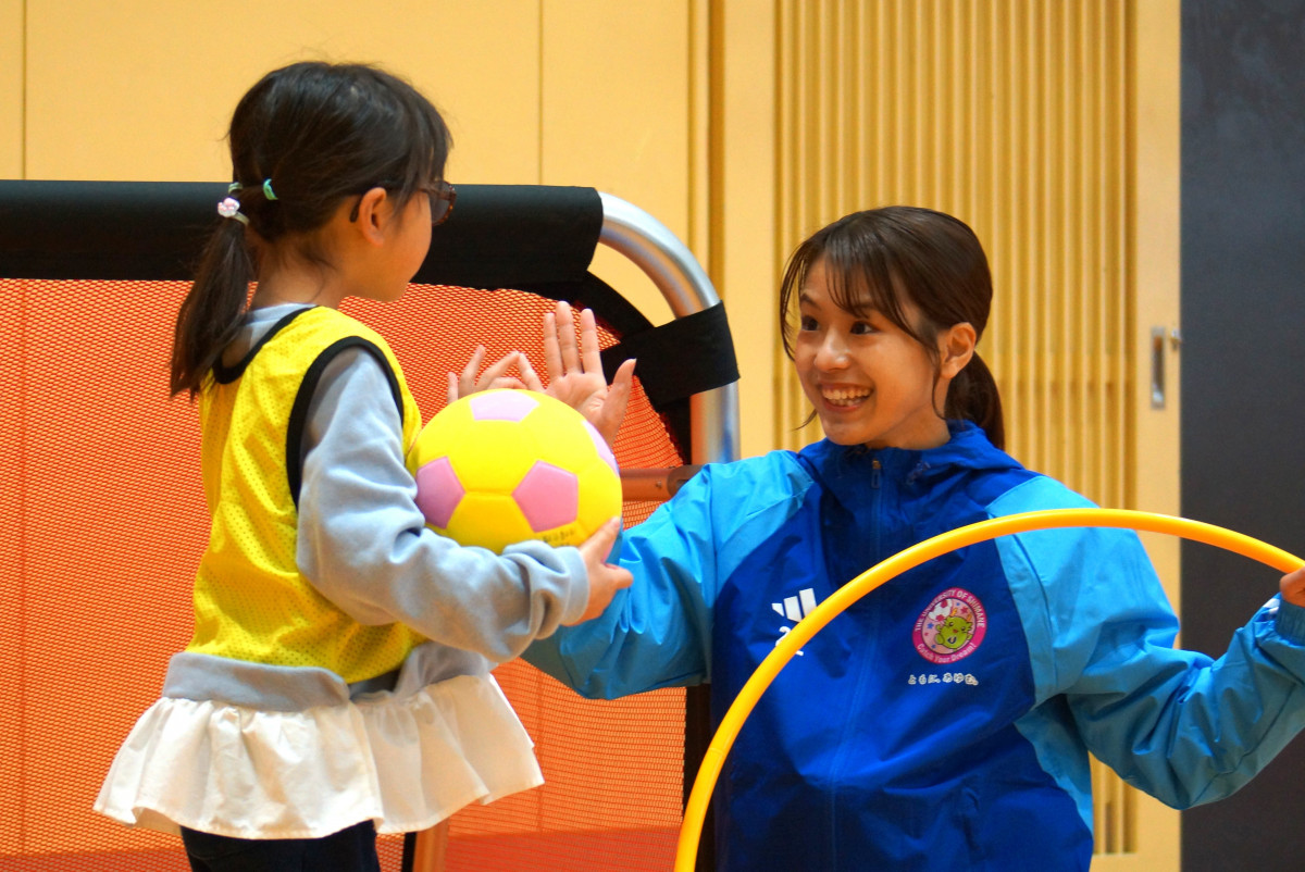 今回は、未就学児の幼児40名、小学校1年から3年までの女子児童29名、(公財)日本サッカー協会公認キッズリーダー資格を取得した本学の保育学科・保育教育学科・地域文化学科で学ぶKENDAI NADESHIKO F.C.C(県大なでしこ地域貢献サークル)の学生30名が参加し、様々な運動あそびを楽しみました。