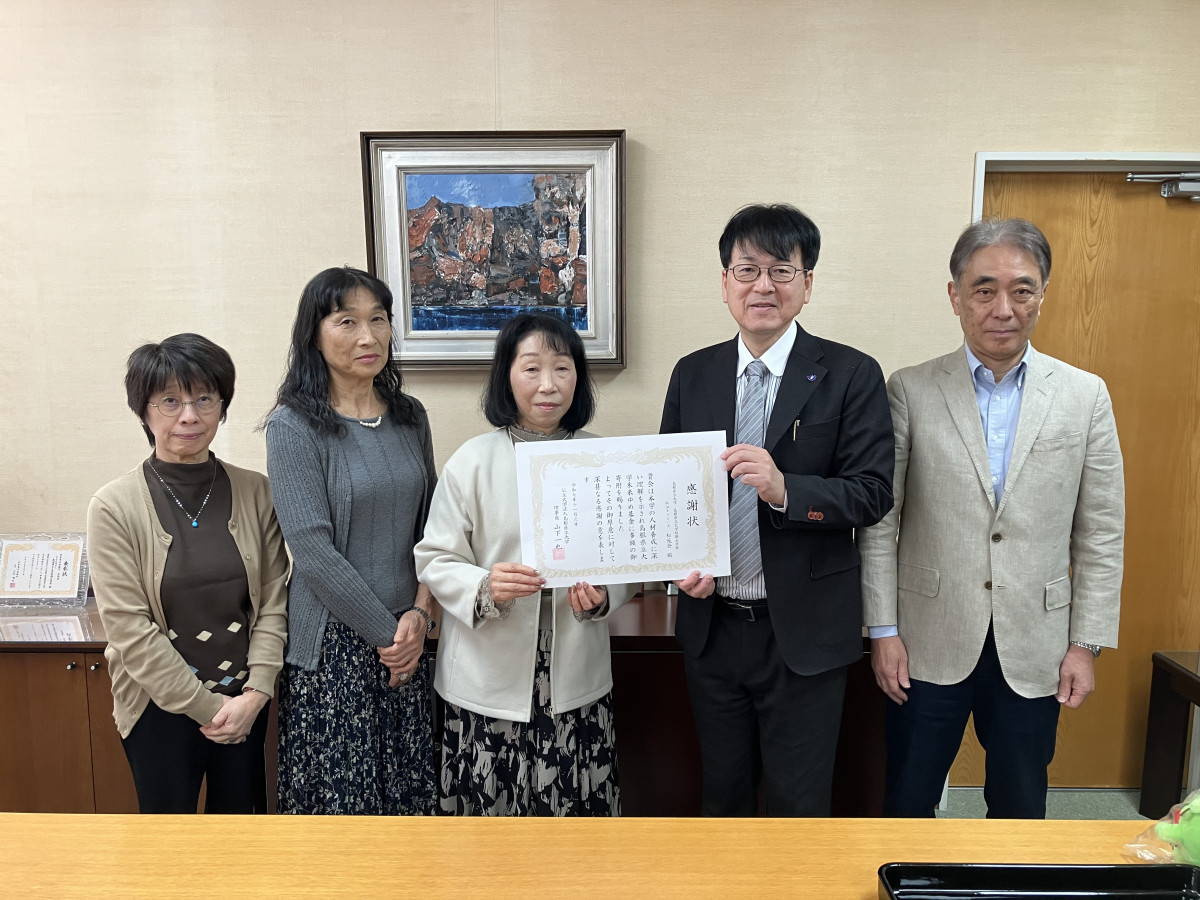 令和7年11月6日(木)、本学にご寄附を賜りました島根県立大学・島根県立大学短期大学部 松江キャンパス松苑会様に対して、松江キャンパスにおいて感謝状贈呈式が行われました。(松苑会会長 布志原久美子様(中央)、副会長 板倉純子様(中央左)、副会長 菊池伴子様(左2)、岩田英作副学長(中央右)、田中浩史事務部長(右2))